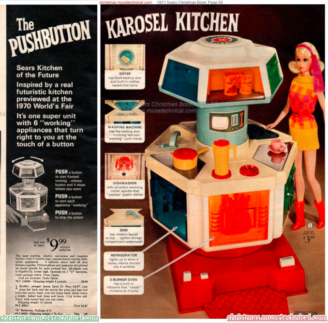 According to the copy in 1971 (above), this kitchen set was based on one demonstrated at the 1970 World’s Fair. I didn’t find many resources about the World’s Fair kitchen prototype, but my searches did lead me to this amazingly detailed Google video about the toy: