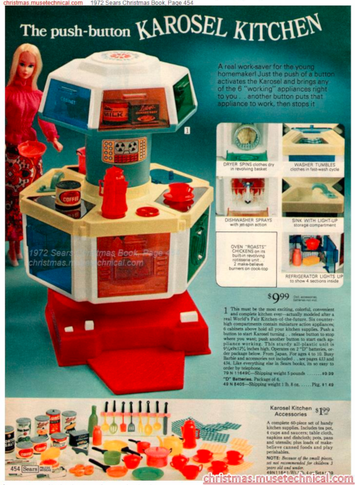 I’ve seen this funny little kitchen listed as a Barbie playset a couple times and was curious about it. I began my investigation with the handy catalog search feature of christmas.musetechnical.com. Although Sears was not shy about letting you know what doll might use the set, it turns out it was actually not Mattel- or Barbie-branded.