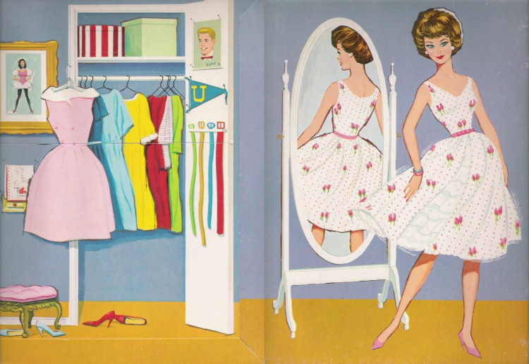 But maybe we’re here to talk fashions. Above, an illustration accompanying a paper doll set shows Barbie trying on Garden Party. Around her room we also see a dress that may be Dancing Doll, some possible pak belts, and a number of closed-toe shoes–improbable for Barbie in 1962, but that’s a topic for another post.