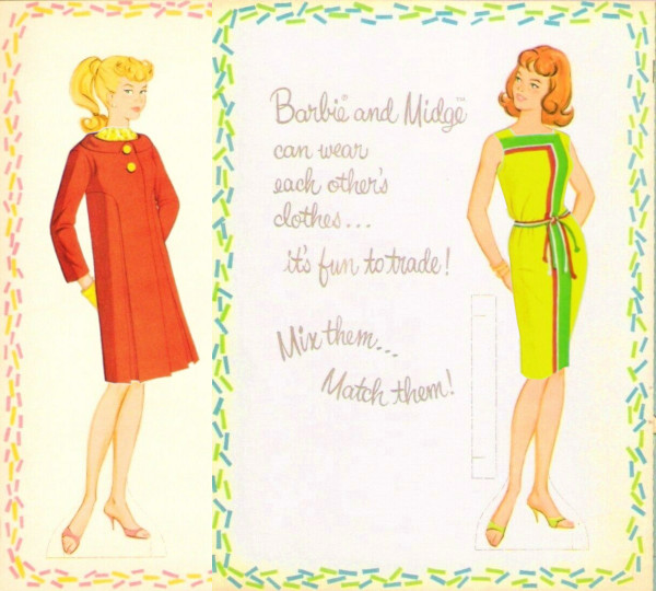 Just as often, the paper doll fashions appear to be originals–maybe designed by someone at Whitman? We know so little about the sources of these illustrations. But often, the new fashions are great–some worthy of OOAK projects, in my opinion. One 1963 set is packed with stylish, elsewhere-nonexistent fashions for Barbie and Midge. I didn’t recognize a single one of the styles in this set as one that was sold for the real Barbie and Midge: